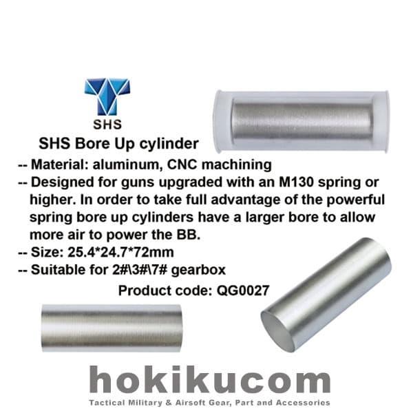 SHS Cylinder Bore Up AEG QG0027 Product Name:SHS Bore Up Cylinder Product Introduction: Material: aluminum, CNC machining Designed for guns upgraded with an M130 spring or higher. In order to take full advantage of the powerful spring bore up cylinders have a larger bore to allow more air to power the BB. Size: 25.4*24.7*72mm Suitable for 2# 3# 7# gearbox SKU : GBM-0082